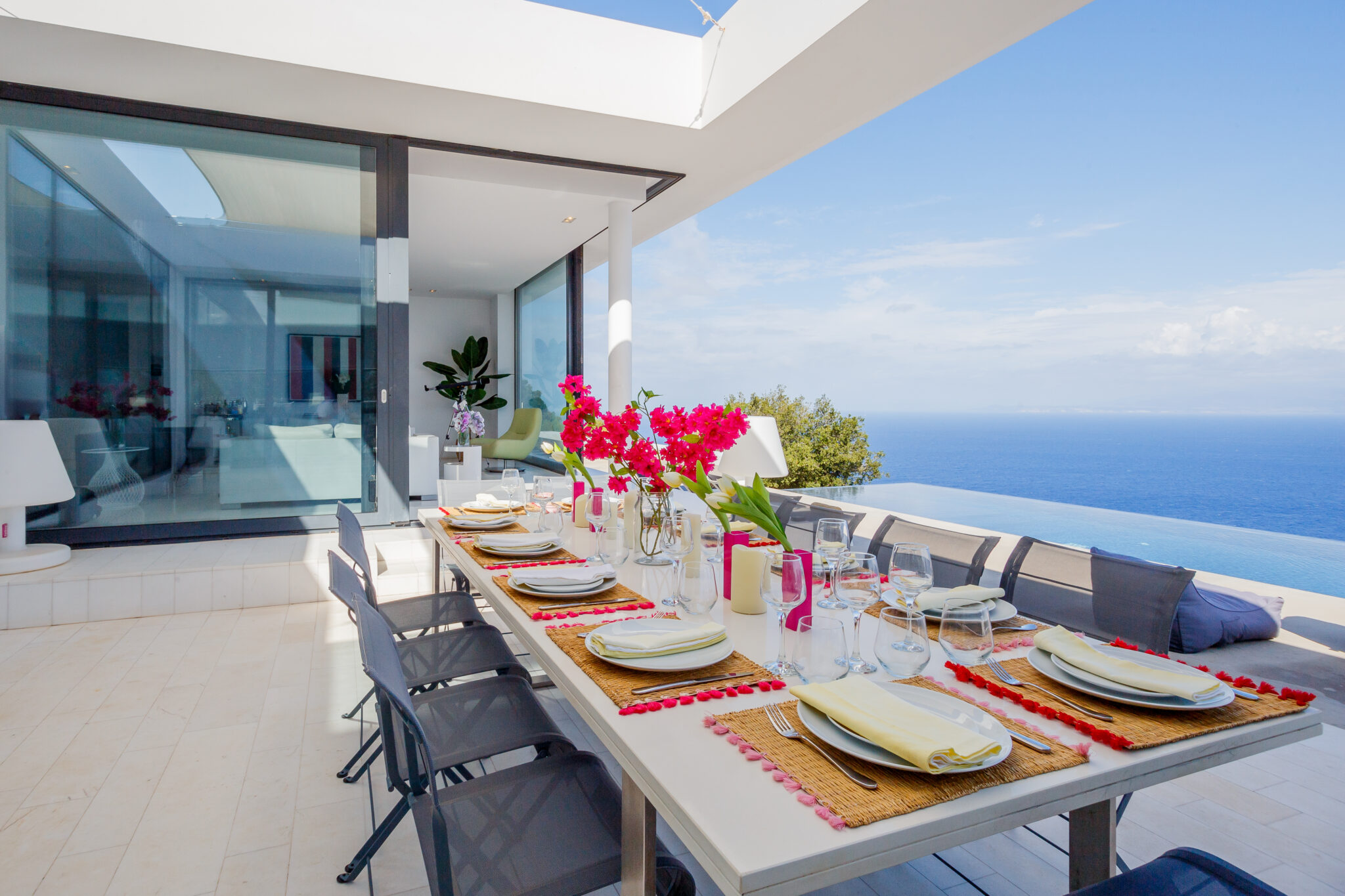 Outside through the sliding doors is the terrace beside the infinity edged pool, a stunning dining area and BBQ.