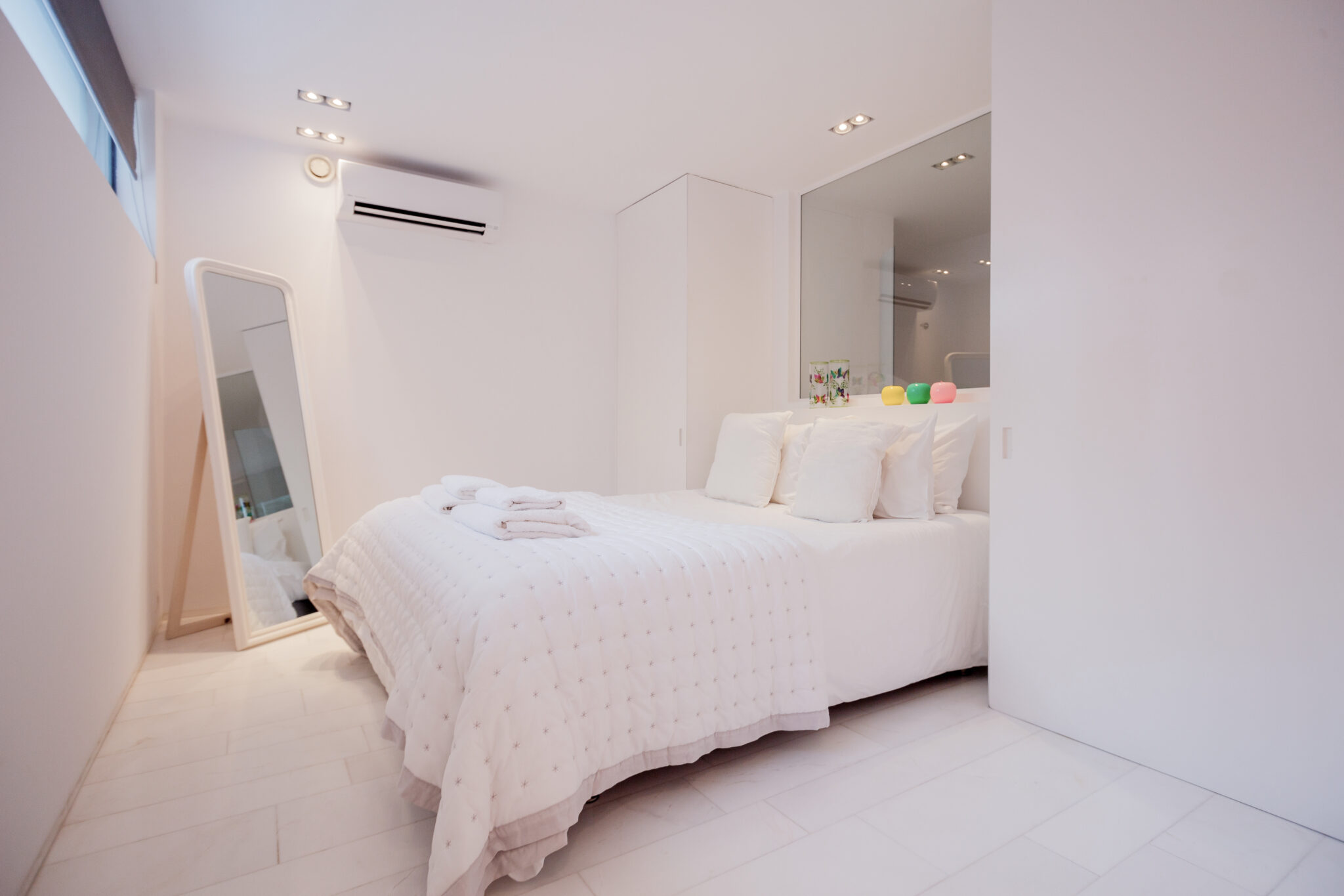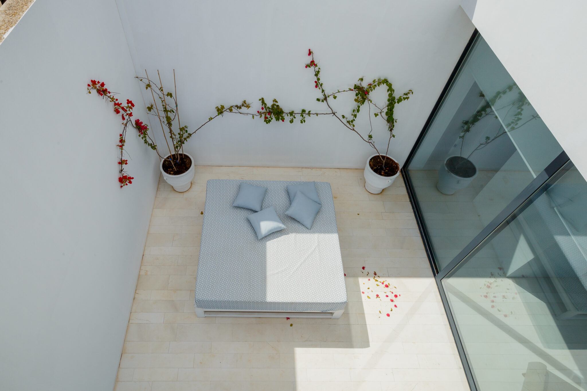 Arriving into the driveway, adjacent to the parking area to the side of the house, you enter through a corridor of solid rock which opens out revealing a bold wall of perfect white render, slowly showing little glimpses of what is to be found beyond.