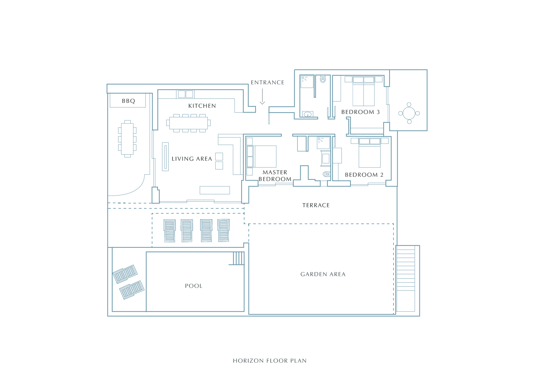 Thanks to Horizon’s one-level layout, the open-plan kitchen and dining room open directly to the pool terrace via sliding glass doors. Once outside, wander higher to the BBQ and dining space terrace where, if possible, the views become even better for you and your guests.