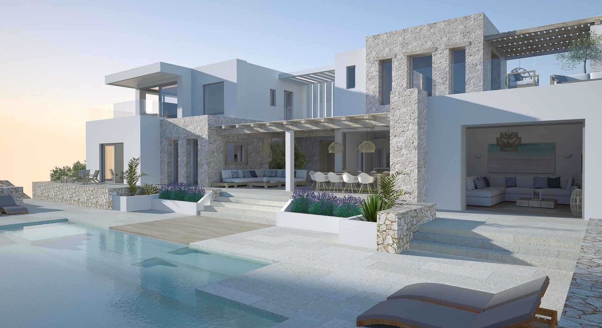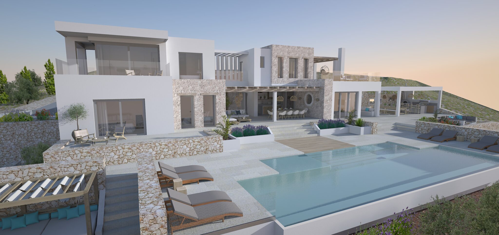 Kyanos has 5 stylish bedrooms. All have their own bathrooms and some have sweeping terraces. The minimalist interiors are finished with raw, natural materials and fabulous rattan features.