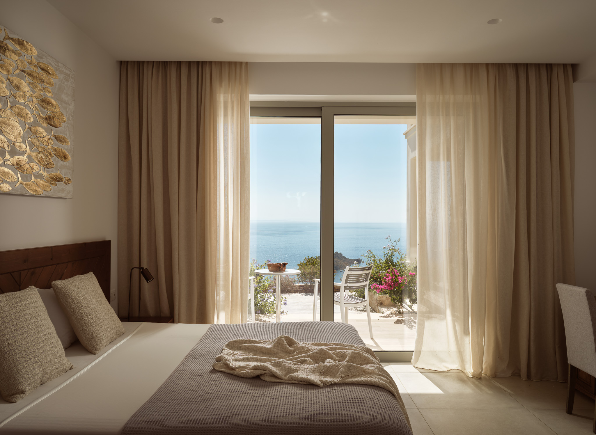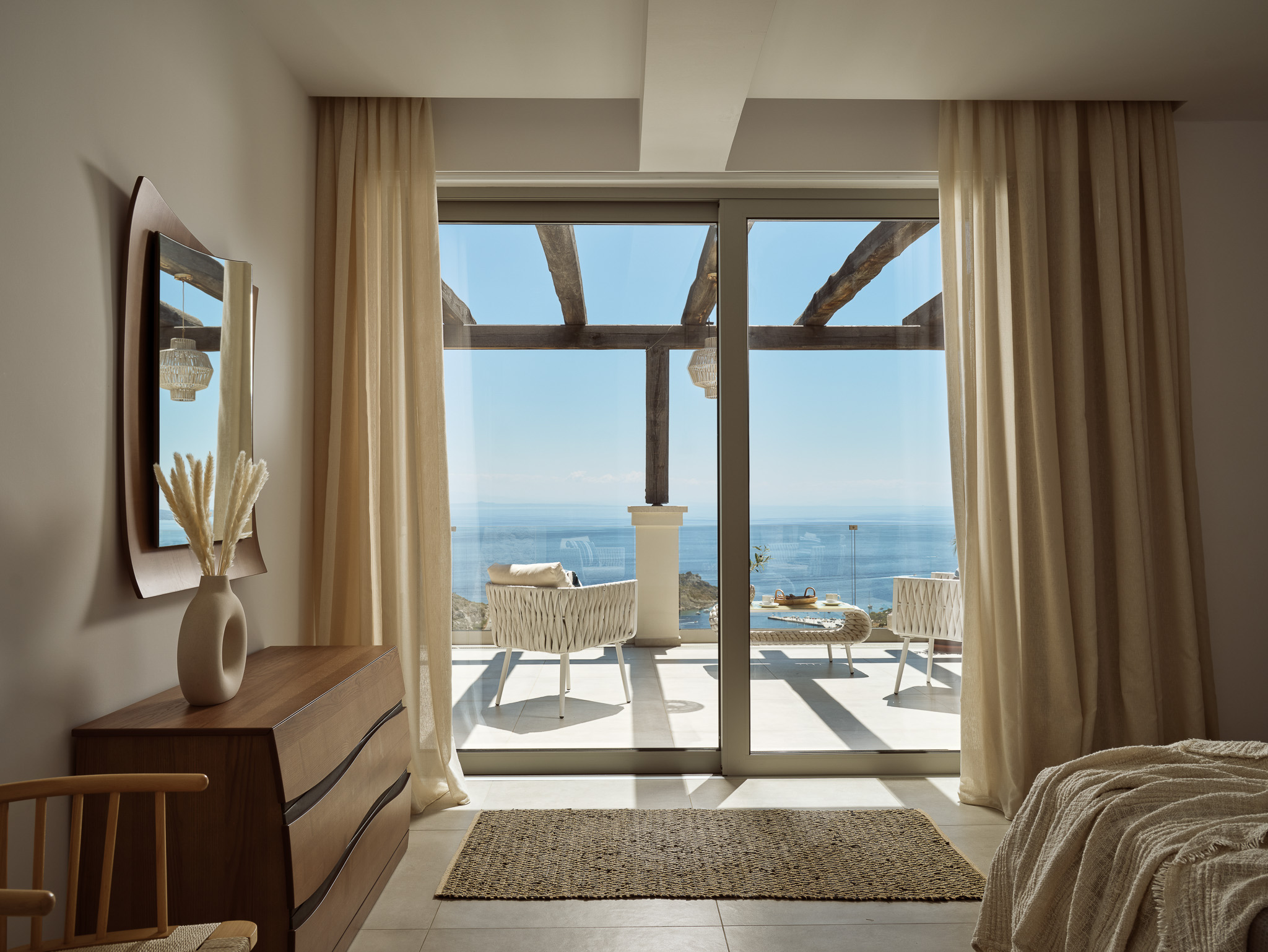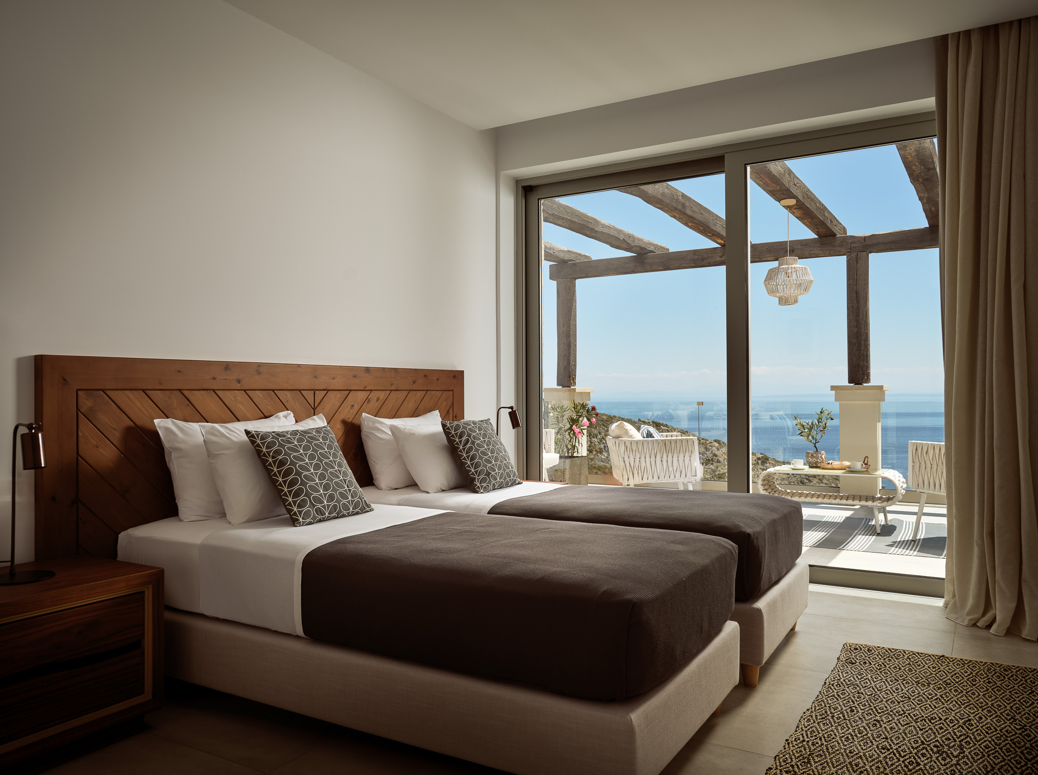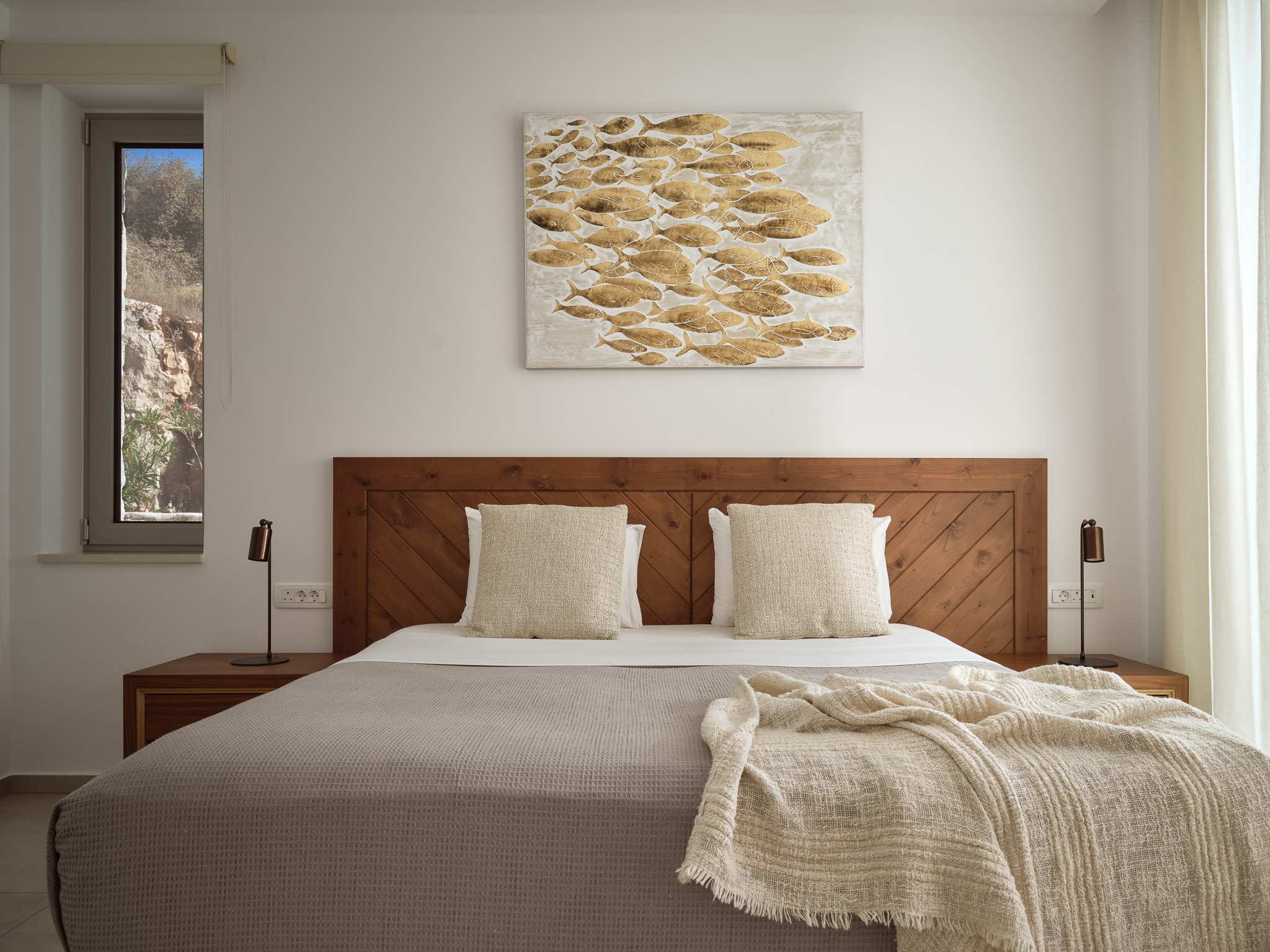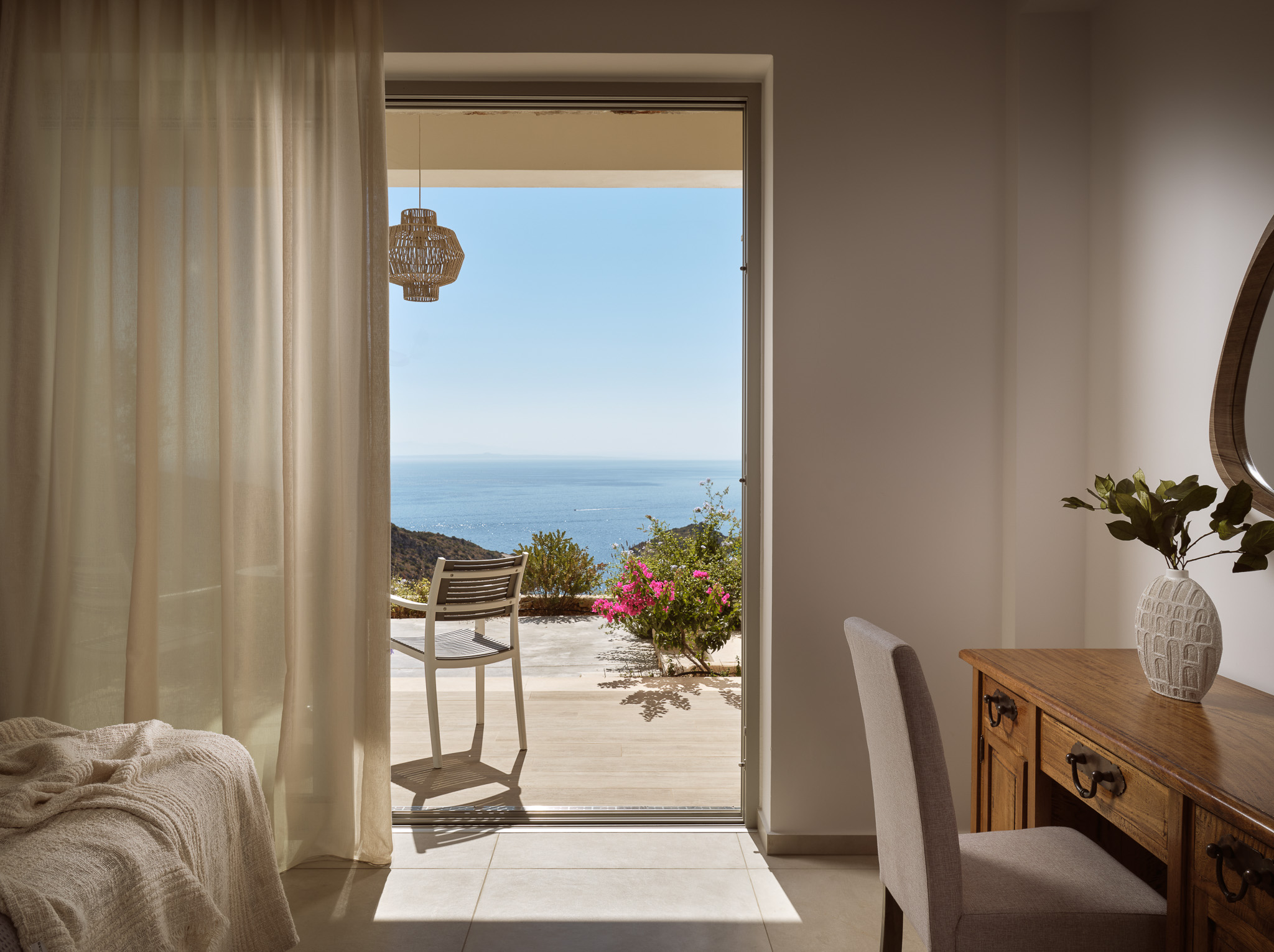 There are four bedrooms split across two floors. Each bedroom has fantastic views of the pretty port of Agios Nikolaos and Ionian Sea as well as patios accessible from each room through sliding doors. Each room has a large fitted wardrobe.