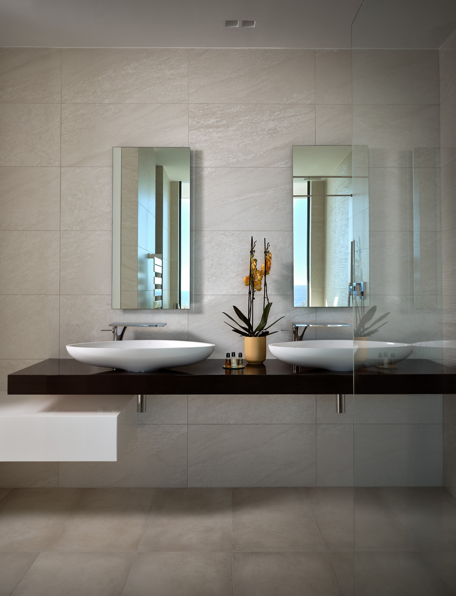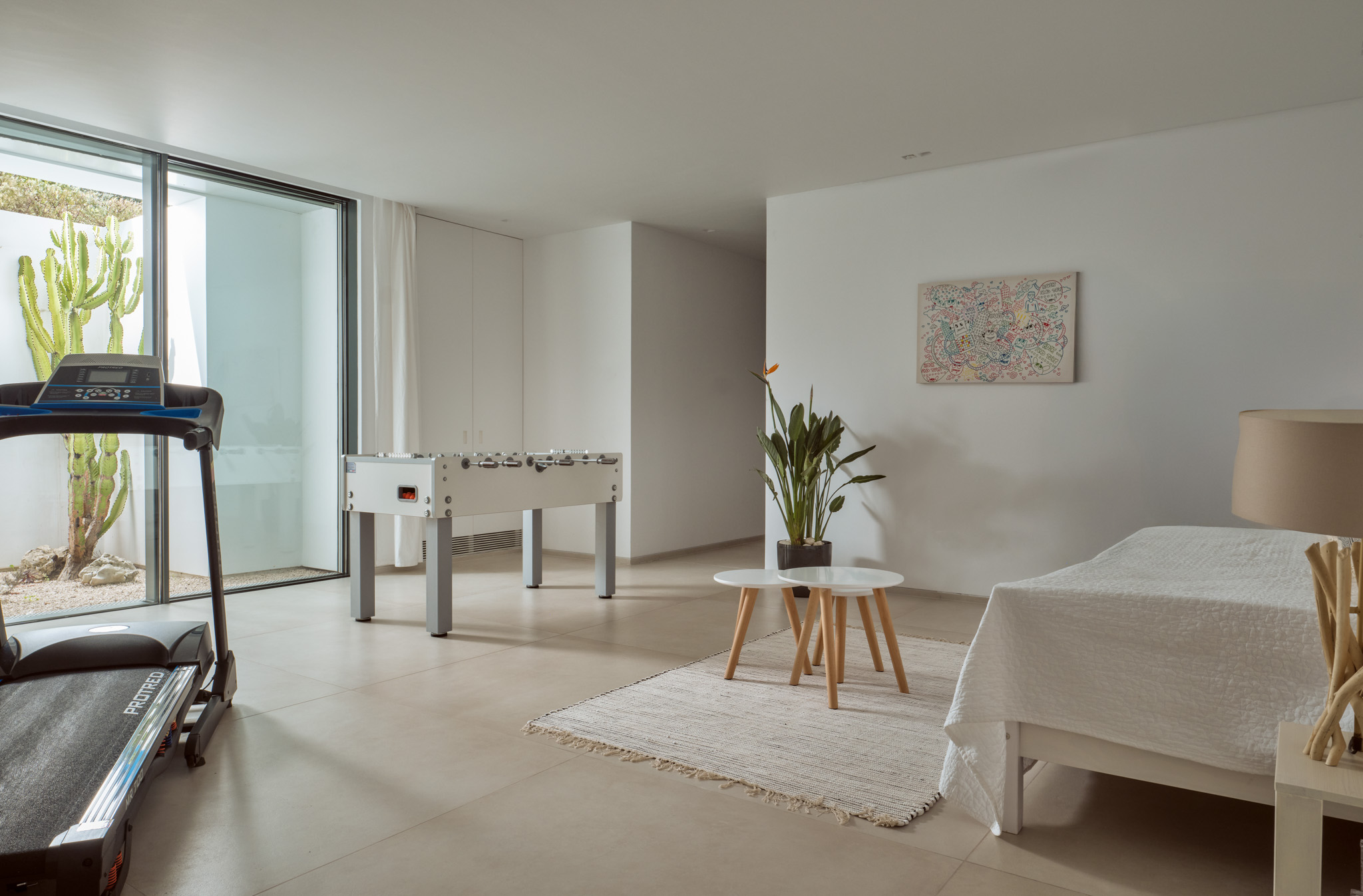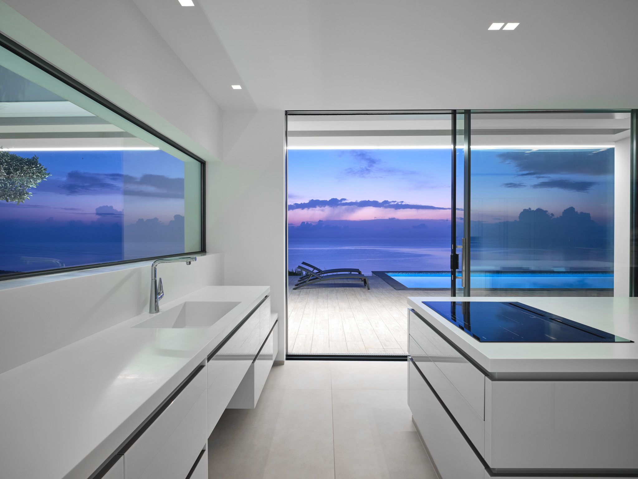 Philia has five beautiful bedrooms, two with super-king beds and two with king beds, while on the lower level, the fifth bedroom has been set up in a dormitory style for the kids. Every bedroom is equipped with its own en-suite bathroom. The rooms on the ground and first floors take advantage of the villa’s remarkable setting with floor-to-ceiling windows that show off the endless sea views.