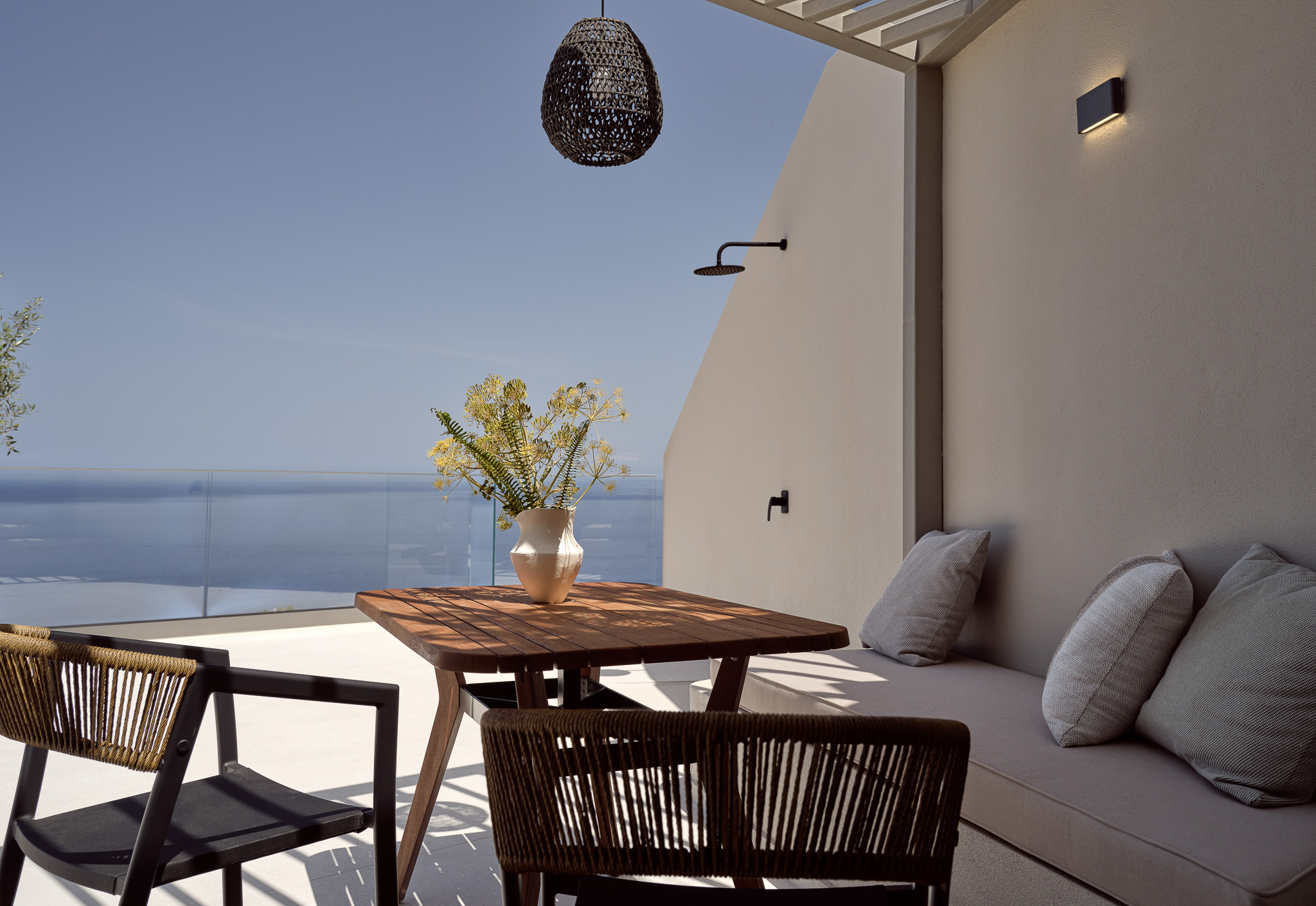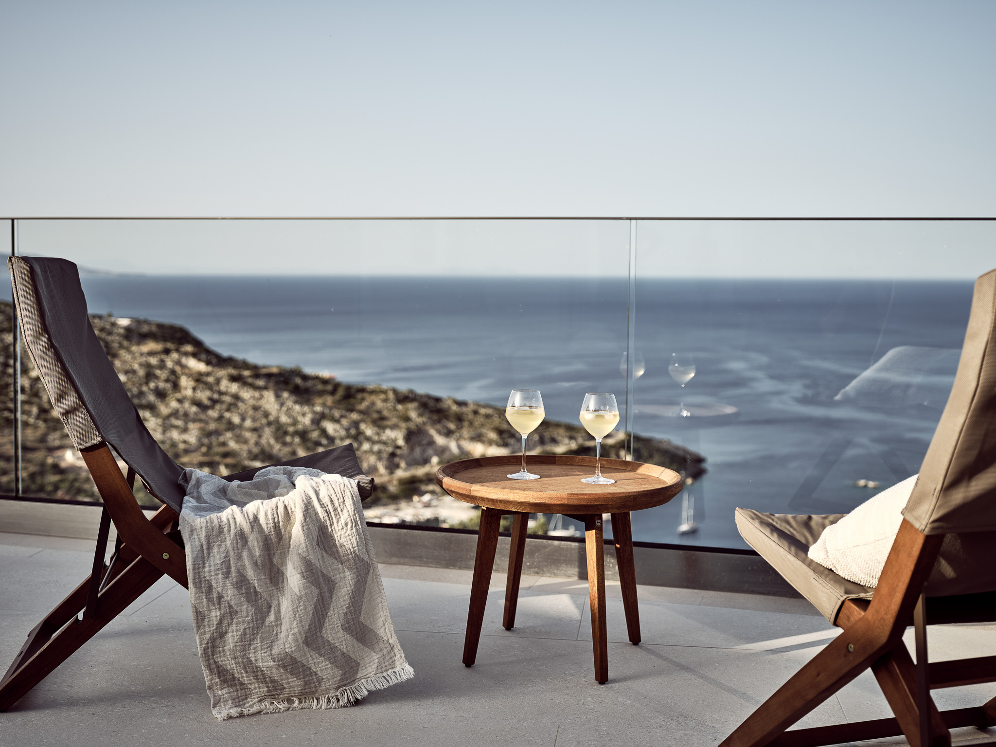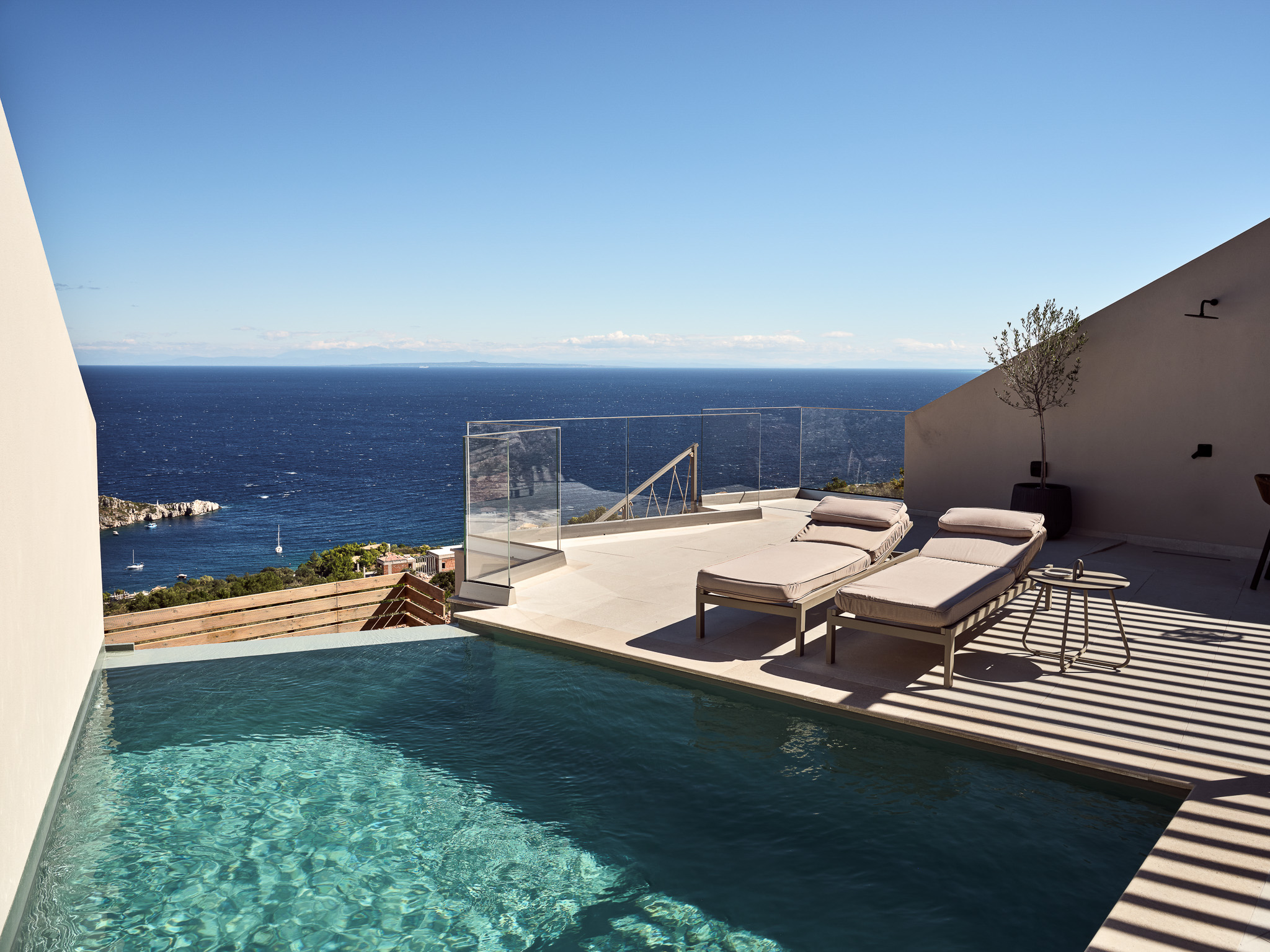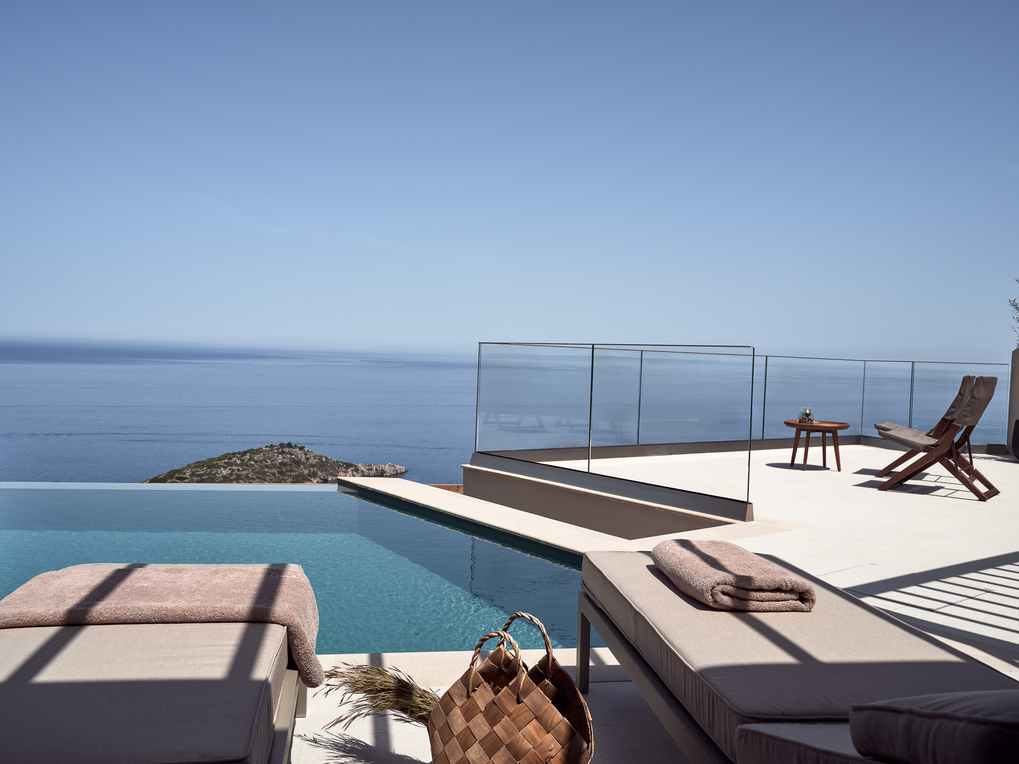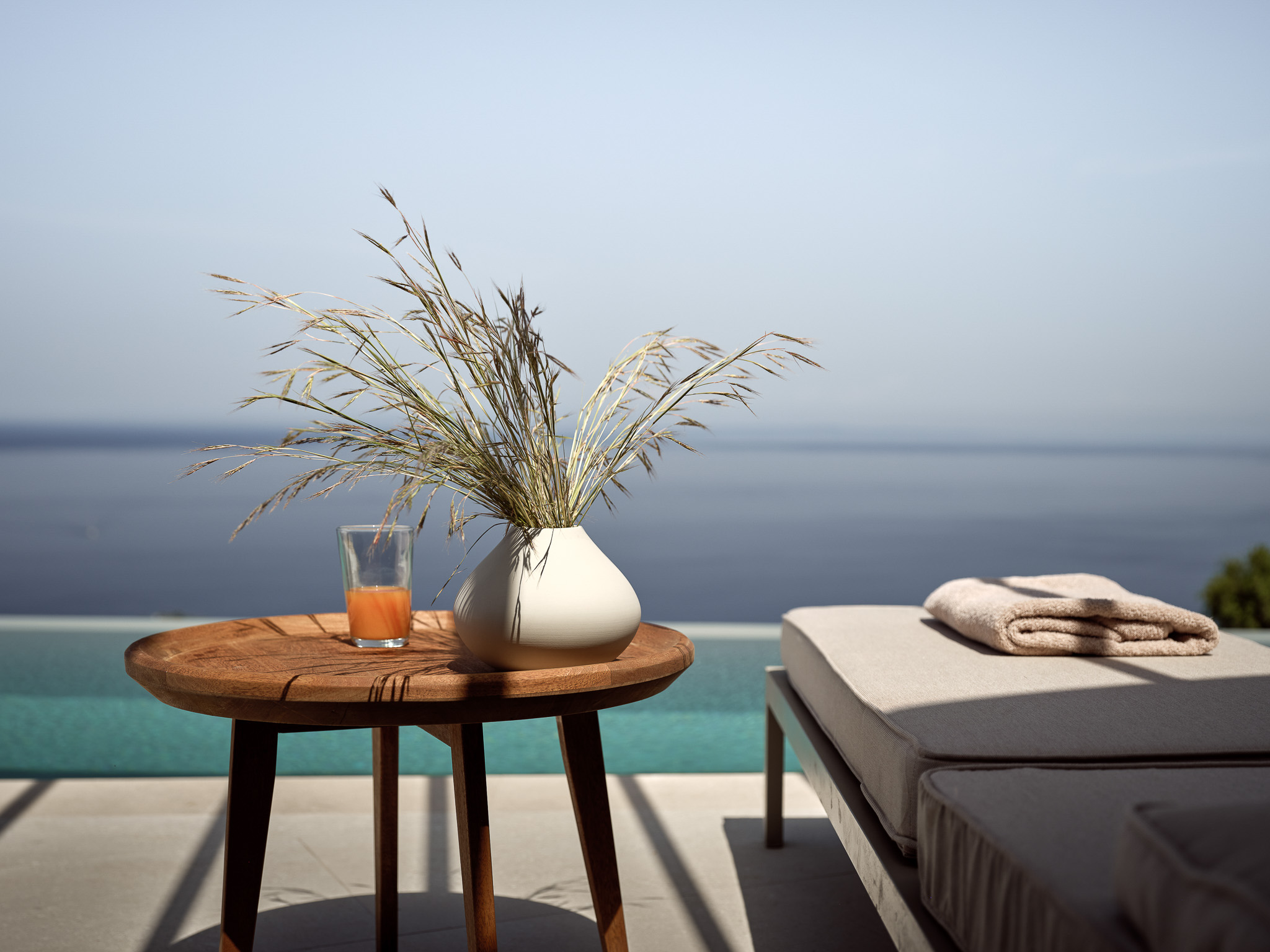 The suites each have access to a beautiful wooden yoga deck overlooking the sea, with weights, a bench, yoga mats, and bands – perfect for morning workouts overlooking the sea. Spend your days relaxing on the sun loungers around the pool, soaking up those endless sea views.